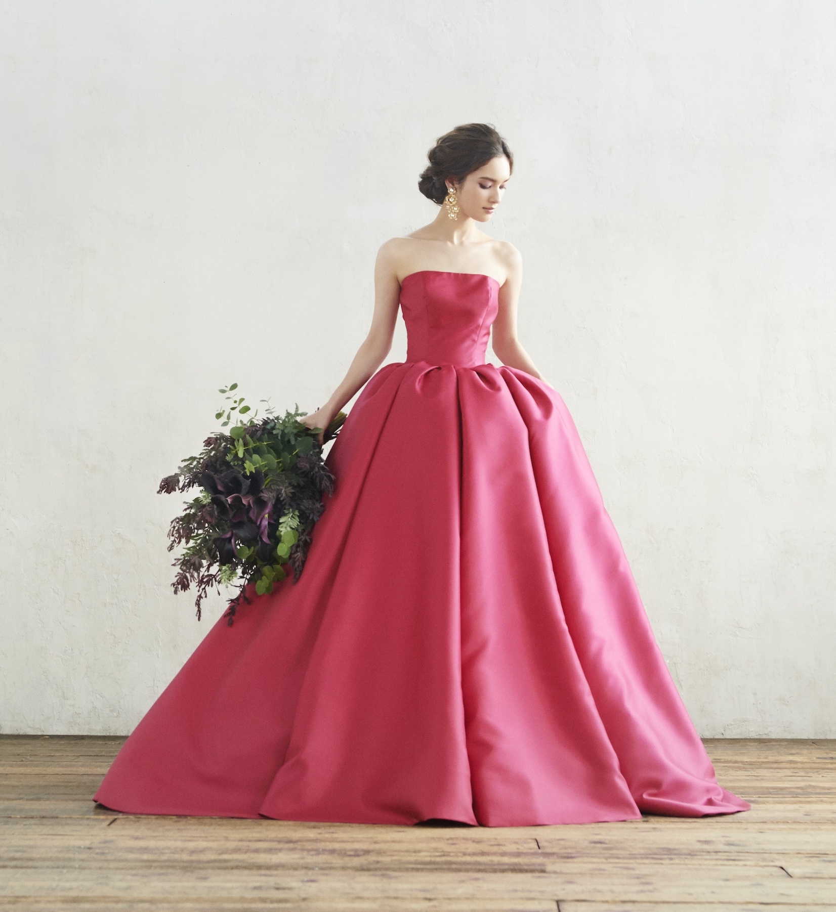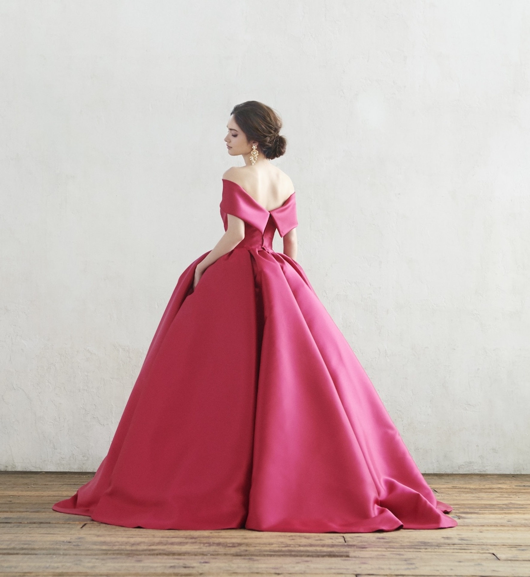 鮮やかなチェリーピンクのカラードレス。 ミカド素材ならではのシルエットが 理想的なボリュームを叶え バックスタイルも魅力的な ケープ付きの2WAYスタイル。