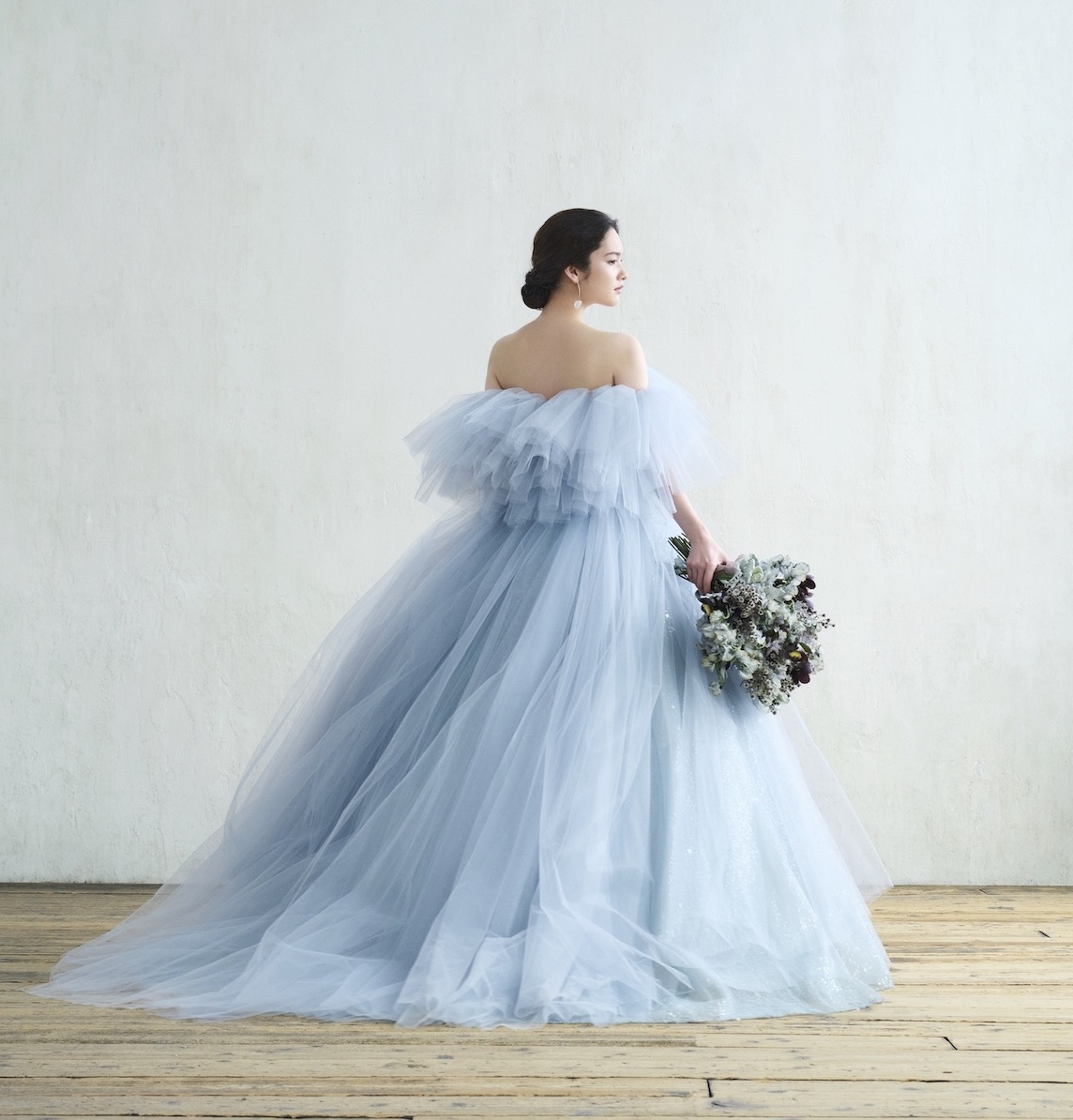 ボリューミーなラッフルケープの オフショルダーはエアリーで優美なイメージ。 シークインチュール(スパンチュール)の 上品な煌めきが魅力的なAライン。 アイスブルーのカラードレス。 ※Other colors_Blush/Cocoa/Pink/Rose Pink/Off White