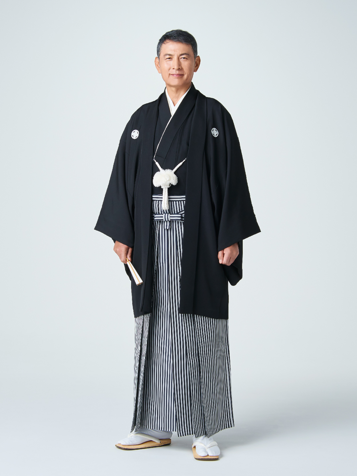 五つ紋付黒羽二重の羽織に袴の装いは、 日本の伝統からくる格調の高いもので モーニングコートやタキシードにあたるもの。 家紋は貼紋にて承ります。